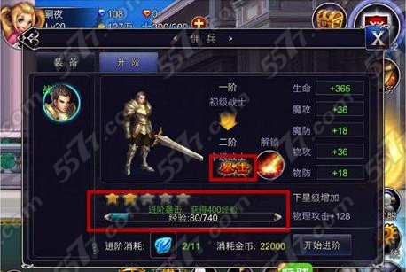然后我们点击开始进阶,消耗一定的灵魂水晶盒金币之后,就能得到进阶经验,进阶经验有几率产生暴击,能获得双倍经验。只要进阶经验条满了,就能提升一个阶级啦。