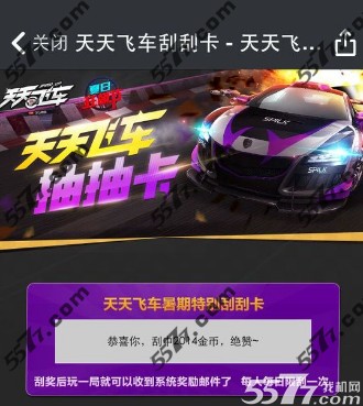 具体参加刮刮乐很简单,玩家进入游戏。玩家进入天天飞车活动页面,点击就可以刮开了,安卓直接点一下,iOS需要点一下还得继续刮一次!那么玩家你加入游戏体验吧!