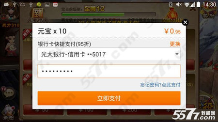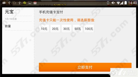 如果您手头有尚未使用的手机充值卡,那也可以充值哦!在支付方式选择界面选择“手机充值卡”,然后选择充值卡面额、输入充值卡序列号和密码即可。请注意:手机充值卡只能一次性使用,所以请您根据您的手机充值卡面额选择相应的充值金额。例如:您的手机充值卡面值是100元,那您必须选择对应100元的充值档——1000元宝进行充值。