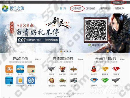 点击右上角的“登录”后,选择顶部菜单的“Q币充值”界面。