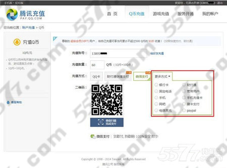 在跳转出的支付页面里,点击充值方式最右侧的“更多方式”。咦,秘密就在这里哟!如果您没有或者不方便开通银行卡/信用卡支付、财付通账户,您可以在这里选择用手机、宽带、固定电话或者网吧等充值方法。
