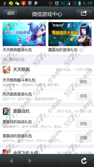 来看看微信游戏中心的这一期的礼包吧!还是相当的丰富的!天天酷跑又2个礼包,雷霆战机也有2个礼包,基本上全民系列和天天系列都是有礼包的!想想都觉得相当的不错,你说呢?