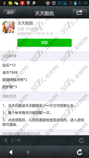 每个账号每天只能领取一次,当天已登陆天天酷跑至少一次方可领取礼包!点击领取礼包后进入游戏就可以查收啦!