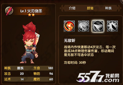 无敌斩:战场内作快速移动4次攻击,每一次造成一定量的物理伤害,移动期间是无敌不可选中状态。