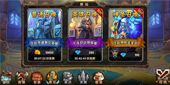 普通召唤技巧:普通召唤每天有5次免费机会、10分钟可以抽取一次,使用金币召唤英雄需要花费10000金币,不过小编并不建议大家使用金币来就行英雄召唤,这样比较的不划算,金币还是留着升级英雄技能吧,在后期升级英雄技能才是王道。使用金币就行普通召唤,可以获得道具和英雄,不过小编每天的几次免费机会抽取的都是一些材料。