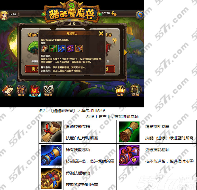 海尔加山战役以“守护世界之树”为主题,每日开放,玩家可免费挑战1次,有4种根据等级开放的难度级别,玩法类似塔防:玩家要面对10波分批到来,分兵分不同路线进攻的怪物海