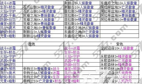 介绍一下表格的使用方法:表格大致分为三个部分,也就是蓝色,混色和紫色。三种颜色分别代表游戏中材料的品质。蓝色代表稀有,紫色代表史诗,混色表示这个地图掉落两只品质的材料。第一列是材料名称,我分别用相应的颜色标注出来,横向往右看就能找到对应掉落的地图,“+”代表的意思是掉落第一列材料的同时额外掉落的材料。