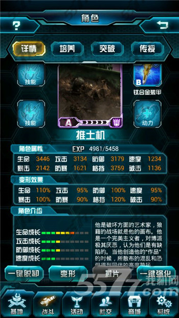 “猛虎”生命中充满无法控制的狂暴,他会猛烈攻击任何靠近他的人,不分敌友,《变形金刚:崛起》中的“猛虎”同样战力惊人,初始攻击高达900,位列A级变形金刚之首,暴击748,破击320,释放技能“集中攻击”,对敌方前排角色造成普通攻击双倍伤害,而且“猛虎”的生命力非常顽强,同样高达900,属于生命力比较顽强的战士。