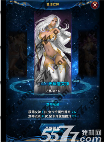 每个女神都有自己特有的女神技能,不仅可以对敌方造成大量的伤害,还可以给自己的队伍带来不错的属性加成。女神进化后可以提升更强大的战斗力。集齐十二星座女神,不仅可以给所有的英灵带来百分比的属性提升,还可以高清大图欣赏十二星座女神。每一个星座女神的召唤都要使用特殊的道具召唤—星座之吻。星座之吻的获得可以在剧情副本、竞技场功勋商店、VIP特权、公会商店购买。女神可以进化,进化后会大量提升战斗力。进化女神所需要的道具为—核心。