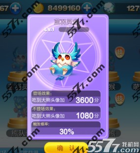 蓝羽灵雀的技能消耗为吃到大熊头像加分,小编感觉这个技能非常的鸡肋,虽然加分很多,但是小编说明的是,玩家挑战一次碰到大熊头的几率非常小,最大也就2、3次而已,那么加分再多也没有用。