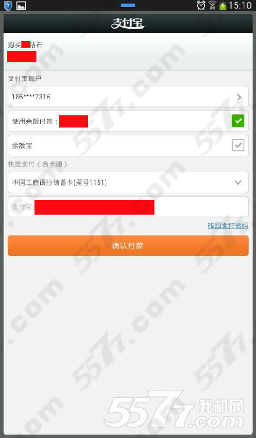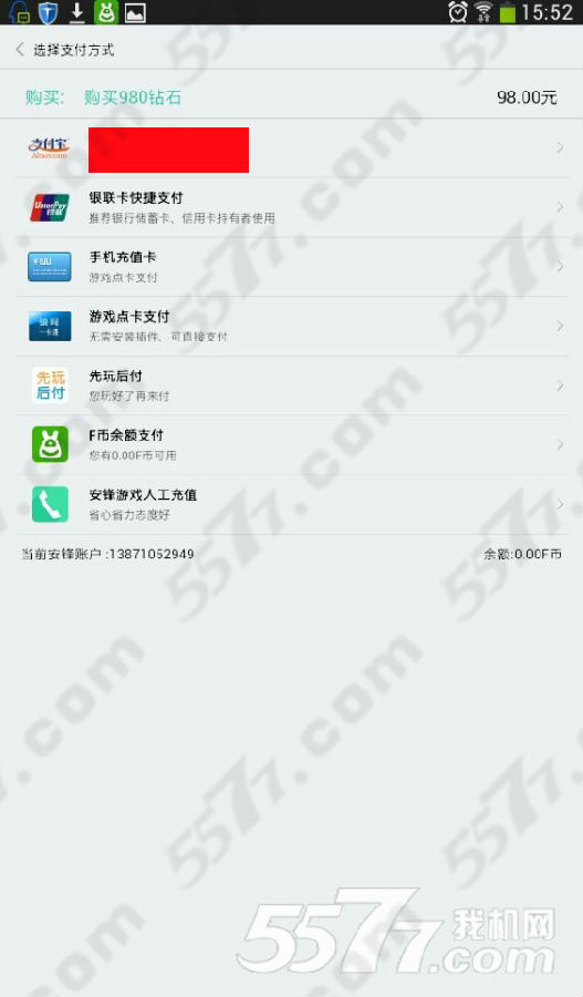 3、点击购买后就会弹如下图的支付界面,小编建议使用支付宝。用银行卡玩家需要在手机上面安装程序,小编不推荐。