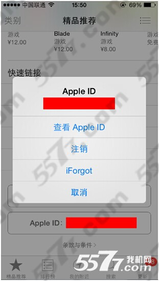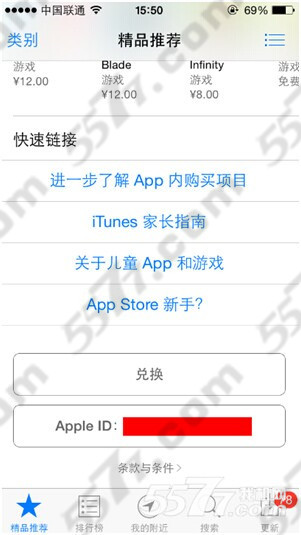 ,进入到精品推荐,并且将页面拉至底部。如果账户上有余额,在Apple ID的信息下会有金额显示,不过这个金额与电脑端的会有时间差,充值后并不会立即变化。
