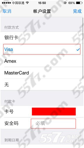 4、在账户付款信息界面选择你拥有的Visa信用卡选项,并仔细填写信用卡卡号信息,同时填写下方的账单寄送地址信息;