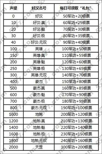 3、根据当前的声望,可获得相应的名号,每晚10点演武堂根据当前玩家们的名号,发放相应的礼包奖励,发放后哥哥们请及时通过点击演武堂内的礼包按钮,领取相应的【军功】和【银票】具体对应的名号如下图所示: