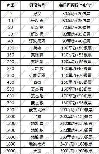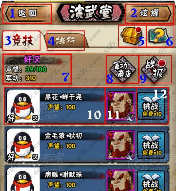 7.名号:在此查看自己在竞技场的获得的名号、声望和军功,军功是玩家当前剩余的军功,名号是由声望的高低而定,军功奖励是由好汉名号的层次高低而定。