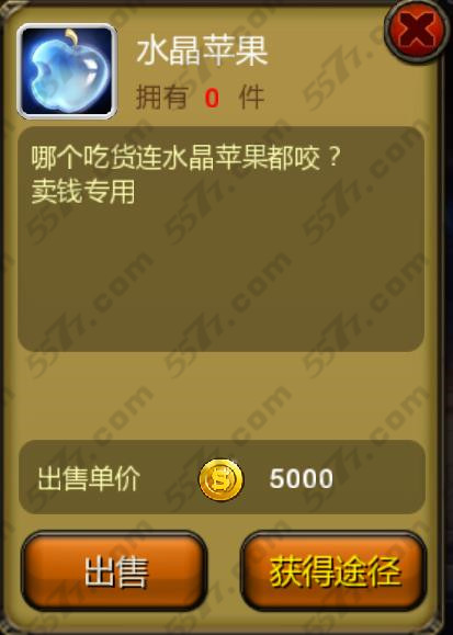 天天英雄水晶苹果是一种材料,没什么大的作用,相对于车牌、房产证等道具来说没有太大的价值,名字虽然好听,但是意义不大,所以建议玩家朋友在获得水晶苹果后,打开背包,然后来将道具卖掉,可以换取5000金币。