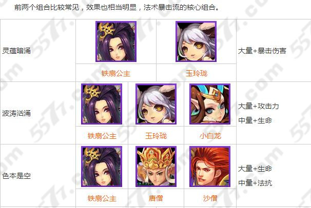 此套阵容的核心为:玉玲珑、铁扇公主和小白龙。三人均为法术攻击,并且必杀技都是群体伤害,所以很容易就可以秒掉对面血少的DPS和奶妈,再加上暴击的话,分分钟就可以结束战斗了。