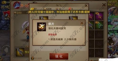 任何兵器的升强化都少不了铁片这东西。所以嘛能多储备铁片就多存点,以后总会用到的,以备不时之需嘛。而到哪里去找铁片呢,那就去黑龙洞和兵械库看看吧。每次我们最多可以探索十二个房间,顺利通过就能得到铁片。此外,我们每次探索兵械库最多可进入12个房间,挑战成功即可获得铁片。此外,我们收买探子进入宝库挑战,同样可以获得不少铁片。最后要说的是,钱多的英雄们可以选择用元宝购买铁片。