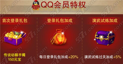 首先是登陆礼包,QQ会员玩家只要登陆三国之刃,就可以获得价值150元宝的传说幼麟手镯