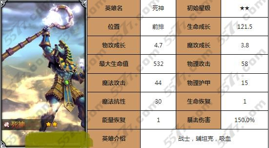 天天英雄死神是前排英雄,属于战士、肉盾型游戏,技能附带吸血效果,可以削弱敌人的护甲,使目标有一个比较不错的衰老效果。沙尘暴技能相对来说还是比较不错的。