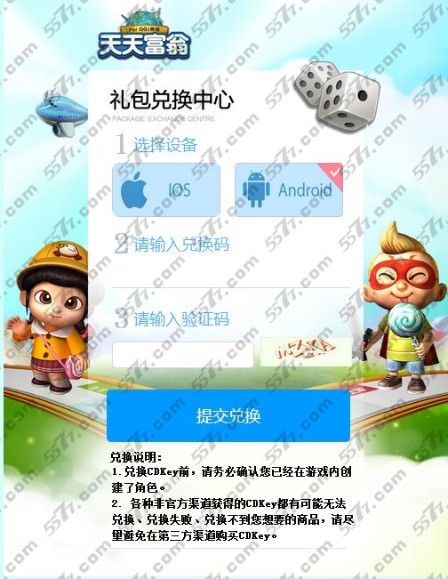 玩家可以关注天天富翁官方微信,或者手机QQ上的游戏中心。经常会有一些活动,官网会通过发放cdkey兑换码的方式赠 送物品。
