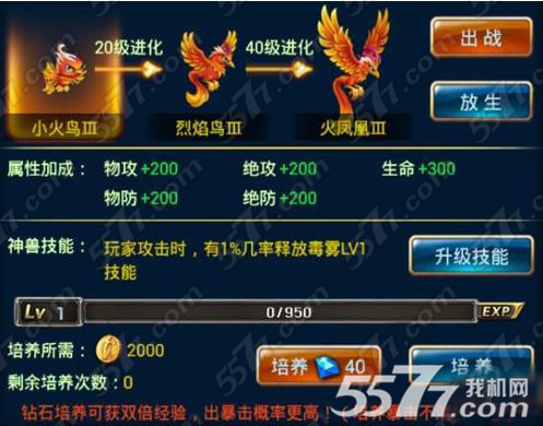 小火鸟到达20级后,可升级为烈焰鸟。40级即升级为火凤凰!通过释放毒雾可以带给玩家伤害。玩家不仅可以选择神兽出战,同时也可以放生神鸟,让它自由飞翔。