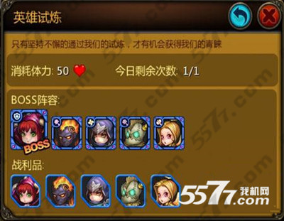 英雄试炼每次挑战需要50点体力,而且每天只能挑战一次