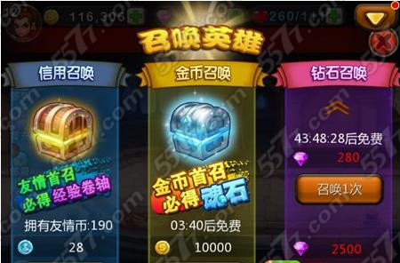 3、钻石召唤:消耗钻石进行召唤,每48小时可免费召唤一次。单召消耗280钻石,十连召可以省去300钻石,有几率掉落高品质的英雄和装备,要是有牛头、火男就赚发了。