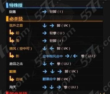 旋踢:向前小跳跃起的踢击,单发时蹲防不能,可衔接在普通攻击和空中必杀技之间