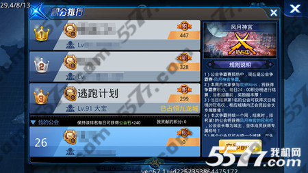 第二、点击参与抢占,可以看到公会的积分排行榜。它是以公会【积分】为计算方式,在指定时间段内积分最多的公会,即成为城主。