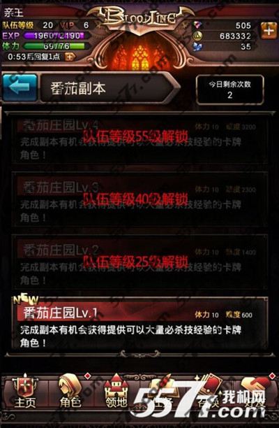 番茄家园每天可闯2次,每次消耗10点体力,难度被系统定位600,难度和迷失乐园要一样,需要玩家拥有不是太差的卡牌都能过,太差的卡牌需要搭配药剂也能过,完成血族番茄家园活动副本,可获得大量必杀技经验的卡牌角色。