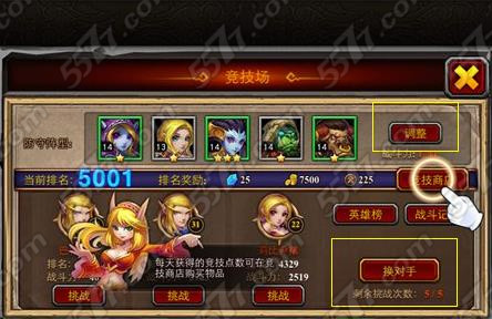 3、玩家可以点击“调整”按钮来变换自己的防守阵型,其他玩家在竞技场挑战你的时候就会和设置好的防守阵型战斗。