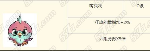 全民切水果萌灰灰是C级宠物,玩家可以通过花费5000杨桃抽奖获得。他的加成属性是狂热能量增加+2%和西瓜分数X5倍。