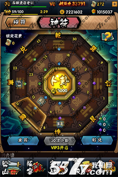 求符最坑,用这八卦图玩大轮盘,每次花铜币,点亮4个绿色格能换绿符。而蓝符需要点亮除艮、坎方向以外的12个格,紫符则需要全部点亮。坑爹的就是这个点亮,带有重复机制,不是亮一次就完了,你可能会重复的在走一个格子,永远凑不全,证明就是图中的”卜卦30次”,安慰奖就是多拿一颗相应颜色的石头,这个咱们待会说。当然还搭配了土豪爽歪歪系统,花了银票的格子你就不会再去了,转而走向新的冤枉路。