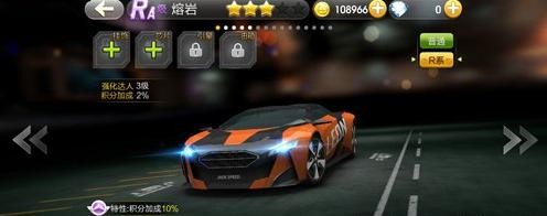 赛车属性:最大速度458KM/h、加速度15.2km/s、节油效率34.7KM、金币加成+10.5%、重量730.00Kg、变道速度+8.5%、里程分加成+10.5%、劫持时间+4秒