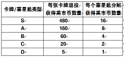 以下是卡牌和塞星匙分解获得的黑市币数量统计表