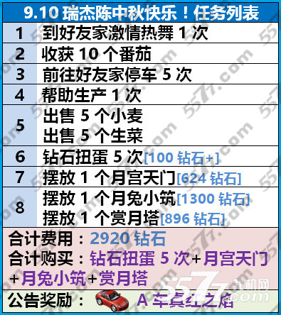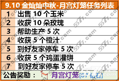 活动规则:九月除了开学季还是全家团圆的中秋佳节,本周小镇送上大惊喜,玩家只需完成本轮连续任务终极闯关,即可赢取中秋好礼“月宫灯笼”一份,“月宫灯笼”为你点亮开学之路哦!