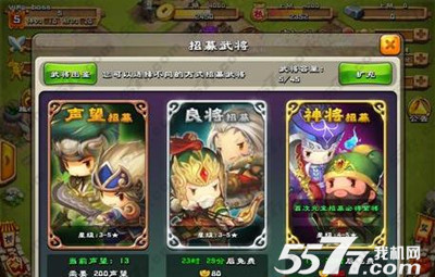 神将招募:有机会获得4-5星的武将,每两天有一次免费召唤的机会,免费召唤一次后需要在等待48小时才可免费。或者也可使用280元宝进行召唤良将。