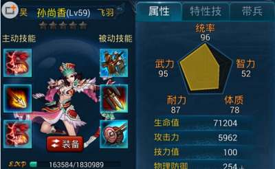 关于签到送的孙MM,虽然第一技能也是小群攻,但无论攻击还是防御都不如大部分紫将,按道理像这种MM橙卡应该搭配辅助技能,可惜她的两个辅助技能都只针对本军团,所以孙MM只能是鸡肋了。