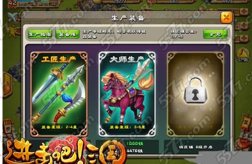 1、铁匠铺中可升级装备也可以铸造新装备,点击“制造”即可进入制造系统,制造装备需要消耗铁,铁可在铁矿中获得。
