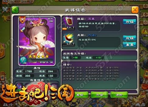 《进击吧!三国》每位武将都有独特的技能,这些技能都是根据三国人物的特点设计的。比如,孟获的技能为“南蛮”,自身免疫一定时间内所有伤害,而曹仁的技能是“据守”,降低一定范围内友军的伤害。不同的武将有不同的特点,他们有些善于群杀,有些善于PK,有些善于支援,玩家可以通过升级武将的技能,来提高战斗中军队的整体实力。