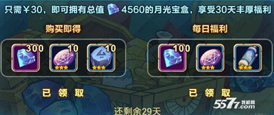 4、跟我一样喜欢充月卡的朋友可以在月光宝盒中领取每日100钻以及首充3倍的900钻。