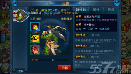 关银屏的3个特性技有防御类的闪避、攻击类的攻击力、攻击伤害,他属于半肉半输出的将领。