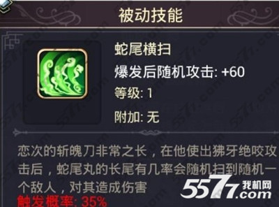 被动技能:蛇尾横扫,攻击时有35%的概率触发,触发后随机攻击+60