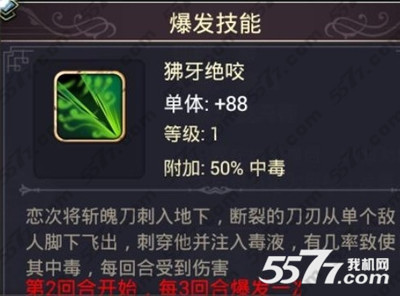 狒牙绝咬:1级单体输出加+88,附加50%的中毒几率(第一次触发为2回合,第二次以后触发为3回合一次)