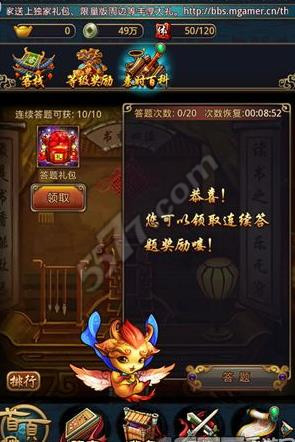 4、最开始可以答题20次,连续答10次可以领取连续答题礼包,里面有刀币呦~每过一段时间就会恢复一次答题次数。