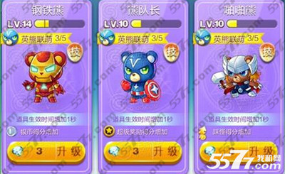 天天酷跑英熊连萌有五个新精灵。可以触发英熊联萌效果的五只英熊有:以蜘蛛侠为原型的大眼熊、以钢铁侠为原型的钢铁熊、以蝙蝠侠为原型的萌萌哒熊、以雷神为原型的啪啪熊和以美国队长为原型的熊队长,只要集齐2只或者2只以上精灵熊就可以触发专属的“英熊联萌”套装效果。