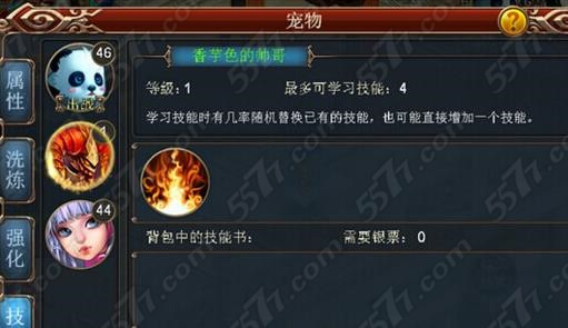 宠物可以通过学习获得新的技能,学习需要相应的技能书和银票,学习技能必定成功;宠物学习技能时在技能数量未达上限时,有几率增加一个宠物技能格子,或顶掉之前原有的某个技能;(宠物技能数量初始上限为4,少数特殊宠物除外);同一种技能已经拥有,是不可再学习;