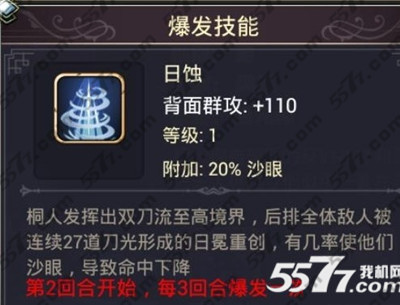 强大的爆发技能,第2回合开始,每3回合爆发一次,攻击后排所有敌人,伤害较高,背面群攻+110,并且还附带20%的几率造成沙眼异常效果,能够让敌人命中率下降。