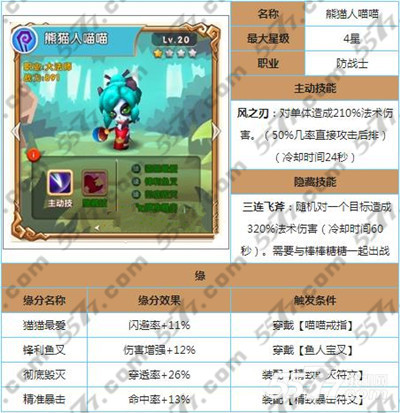 50%攻击后排的几率很实用,相信手游卡牌老玩家们都很在乎这个技能吧,整个游戏周期,后排DPS一直是让人头疼的问题,有了“喵喵”你还拍神马!真乃刷图掠夺,爬塔PK之必备啊!不过没有好T到8级依然鸡肋,因此请土豪们尽情的为熊猫妹子找到一位保驾护航的壮汉吧~